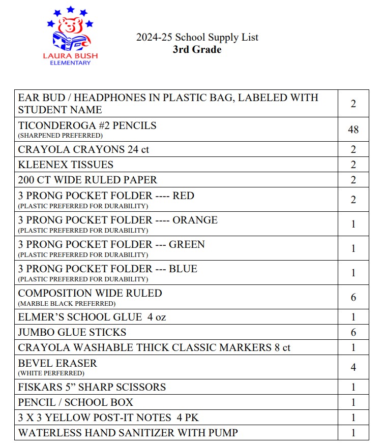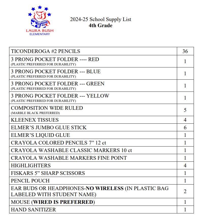 Here are the supply lists for Third Grade and Fourth Grade.