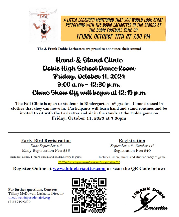 The Lariaettes will be hosting their annual Hand & Stand Clinic on Friday, October 11th. We would like to invite your students to join us that day. Partcipants spend the morning with the Lariaettes learning our stand dances and a short dance to show to their parents. That evening they are able to join the Lariaettes in the stands for the Dobie vs Pearland football game. It's always a fun time.