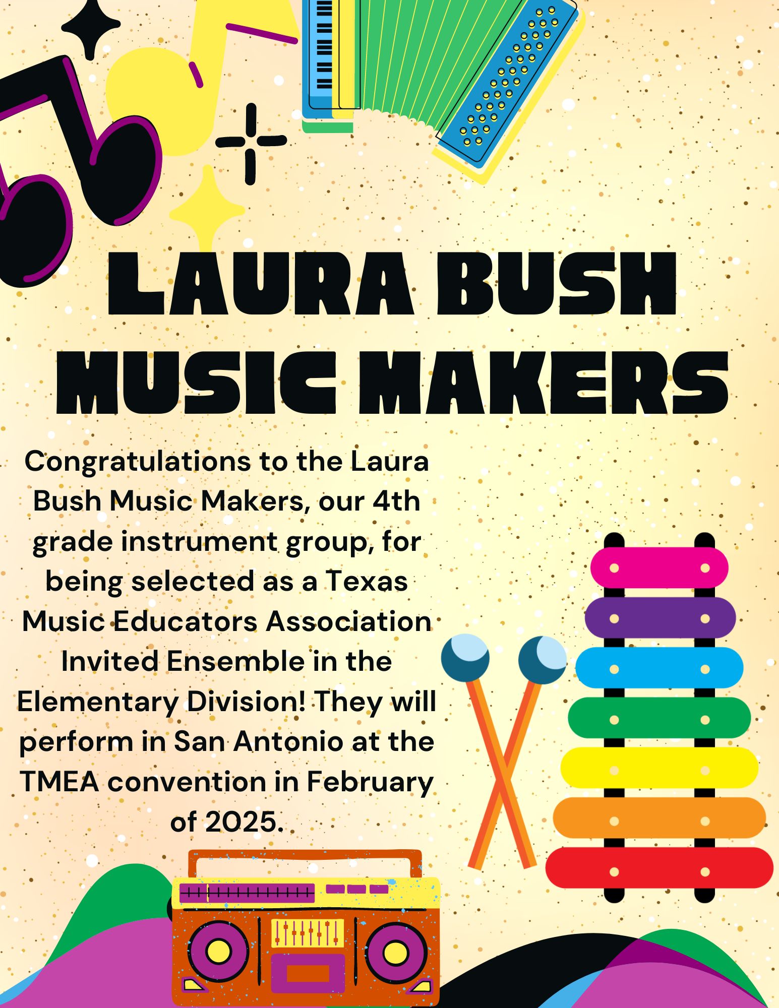 CONGRATULATIONS TO OUR MUSIC TEACHERS AND OUR PREVIOUS 4TH GRADE MUSIC MAKERS OF LAST YEAR! THEIR AMAZING PERFORMANCE HAS WON OUR MUSIC MAKERS FOR THIS YEAR AN INVITATION TO PERFORM AT THE T.M.E.A. CONVENTION IN SAN ANTONTIO. THIS IS A TREMENDOUS HONOR AS THE LAST TIME A GROUP FROM PASADENA I.S.D. WAS INVITED TO PERFORM AT THE CONVENTION WAS IN THE 1990'S. THE T.M.E.A. CONVENTION IS THE NATION'S LARGEST MUSIC EDUCATORS CONVENTION.