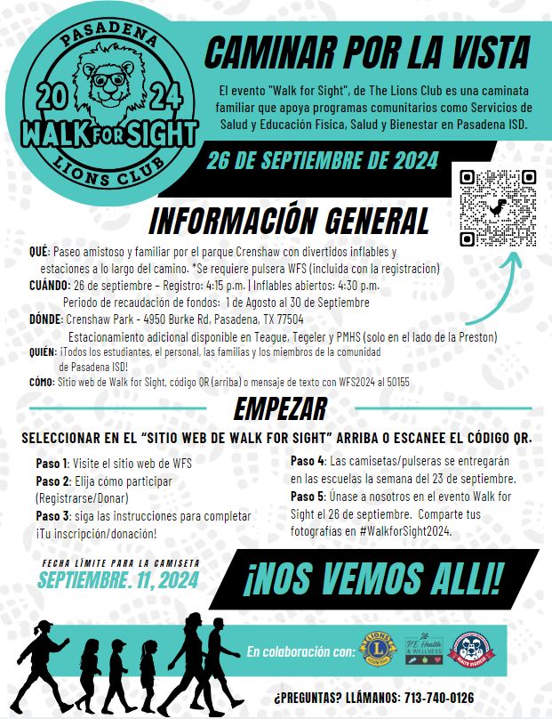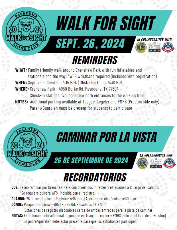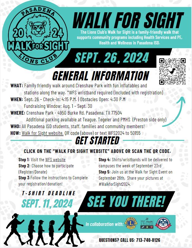 Please join us in supporting the 22nd annual Walk for Sight! The Lions Club’s Walk for Sight is a family-friendly walk that supports community programs such as Health Services and PE, Health and Wellness in Pasadena ISD. Students, teachers, staff and the community are encouraged to engage in online fundraising to raise money for the Walk For Sight and then join us at the walk on Thursday, September 26. Check-in begins at 4:15 and the obstacles open at 4:30. This event is co-sponsored through a partnership between the Pasadena Lions Club, Pasadena ISD P.E./Health and Wellness Department and Health Services.Our Goal is to raise $350 to help support Walk for Sight. Please help us reach our goal!!