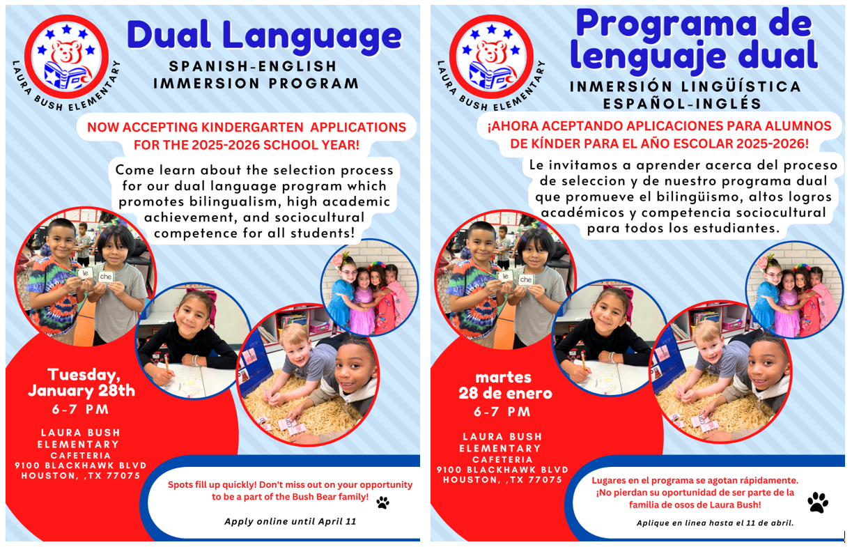 Call us at 713-740-0928 if you have any questions. Learn more about PISD's dual language programs by visiting the PISD Mutlilingual website.